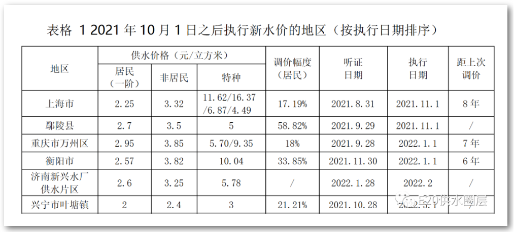 上海市、重慶市萬州區(qū)由于聽證時(shí)間早于2021年10月1日,所以價(jià)格制定仍按照舊版管理辦法執(zhí)行,葉塘鎮(zhèn)雖然聽證會(huì)晚于10月1日,但是從其價(jià)格方案可看出仍按舊版規(guī)定設(shè)置價(jià)格水平,濟(jì)南鋼城區(qū)新興水廠片區(qū)本次調(diào)整目的為將片區(qū)水價(jià)與全區(qū)水平相統(tǒng)一。