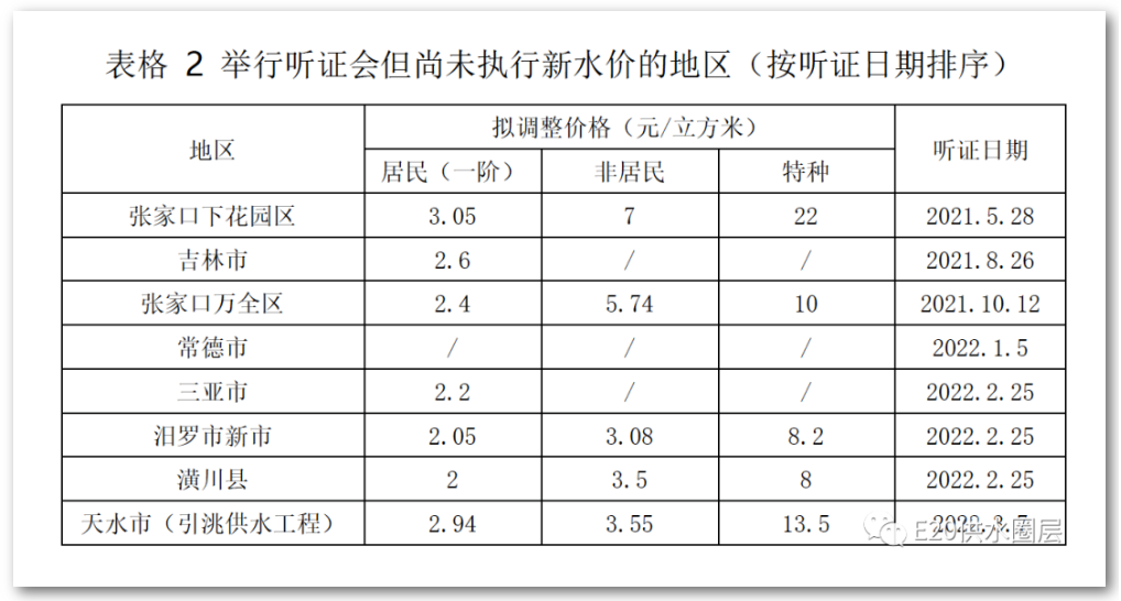 除了上述已執(zhí)行新水價(jià)的地區(qū)外,據(jù)不完全統(tǒng)計(jì),有6個(gè)地區(qū)在10月1日之后舉行了聽證會(huì),預(yù)計(jì)近期將執(zhí)行新水價(jià)。另有張家口下花園區(qū)和吉林市聽證時(shí)間早于10月1日,但至今仍未執(zhí)行新價(jià)格。具體價(jià)格信息可見表2。